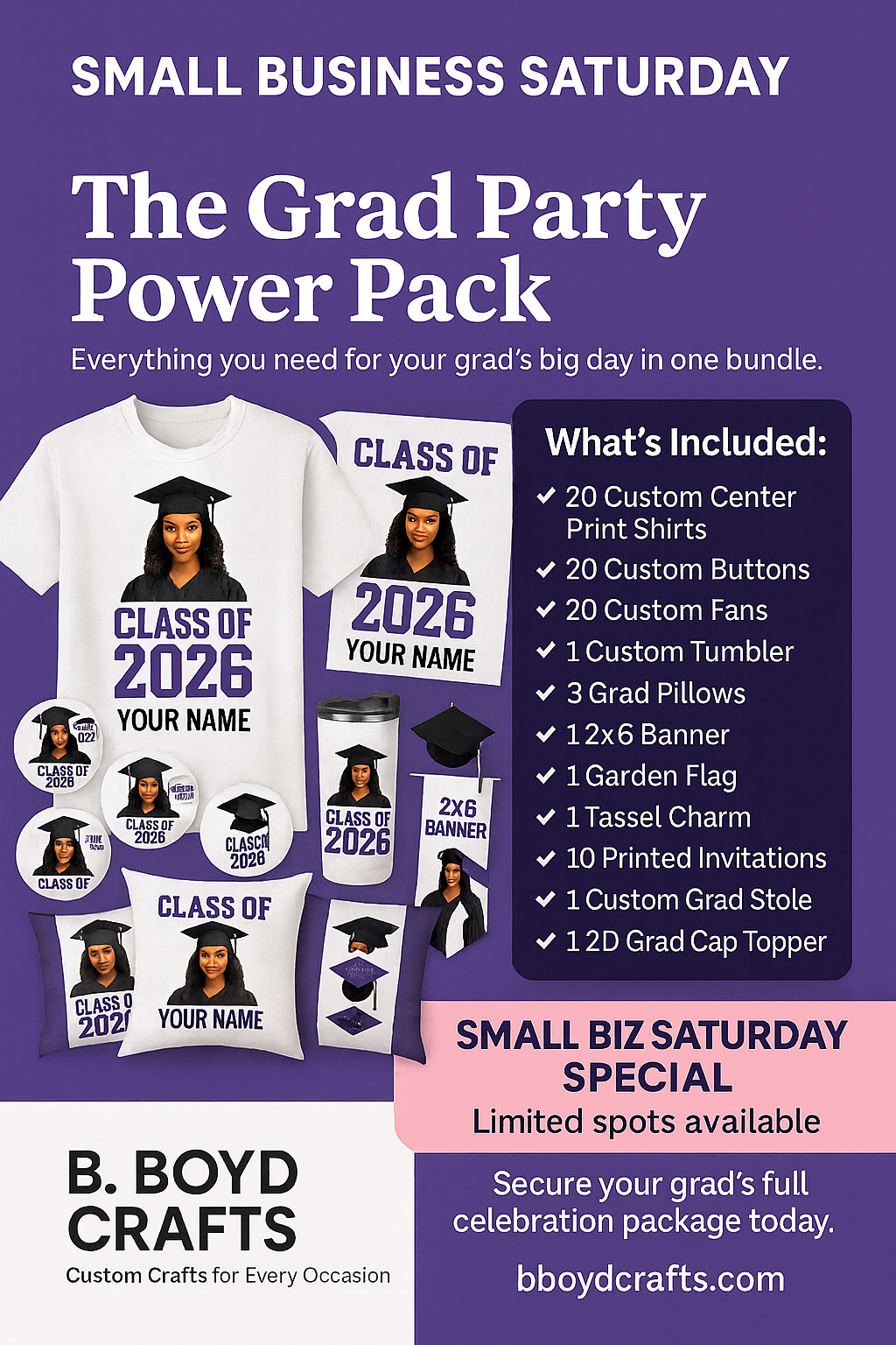Make graduation easy with the Grad Party Power Pack — a full custom bundle for Class of 2026 celebrations. This package includes shirts, fans, buttons, a banner, pillows, a stole, invitations, and more. Everything is personalized for your grad.